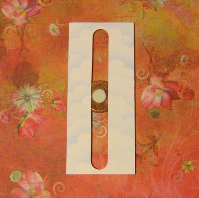 Once I cut my spinner panel, I sponged clouds on it to match the background scene, then marked the middle of the paper with a small line across but not all of the way to the ends, so I would be able to punch a straight line with the Word Window Punch. If you do not have one of these punches, you can do this with a craft knife and straight edge (and pencil markings on the backside to cut by). The width of this punch is 3/8". The width of the cut-out can be any measurement as long as it's less than the diameter of a penny, and the length is totally up to you and the project you are creating.