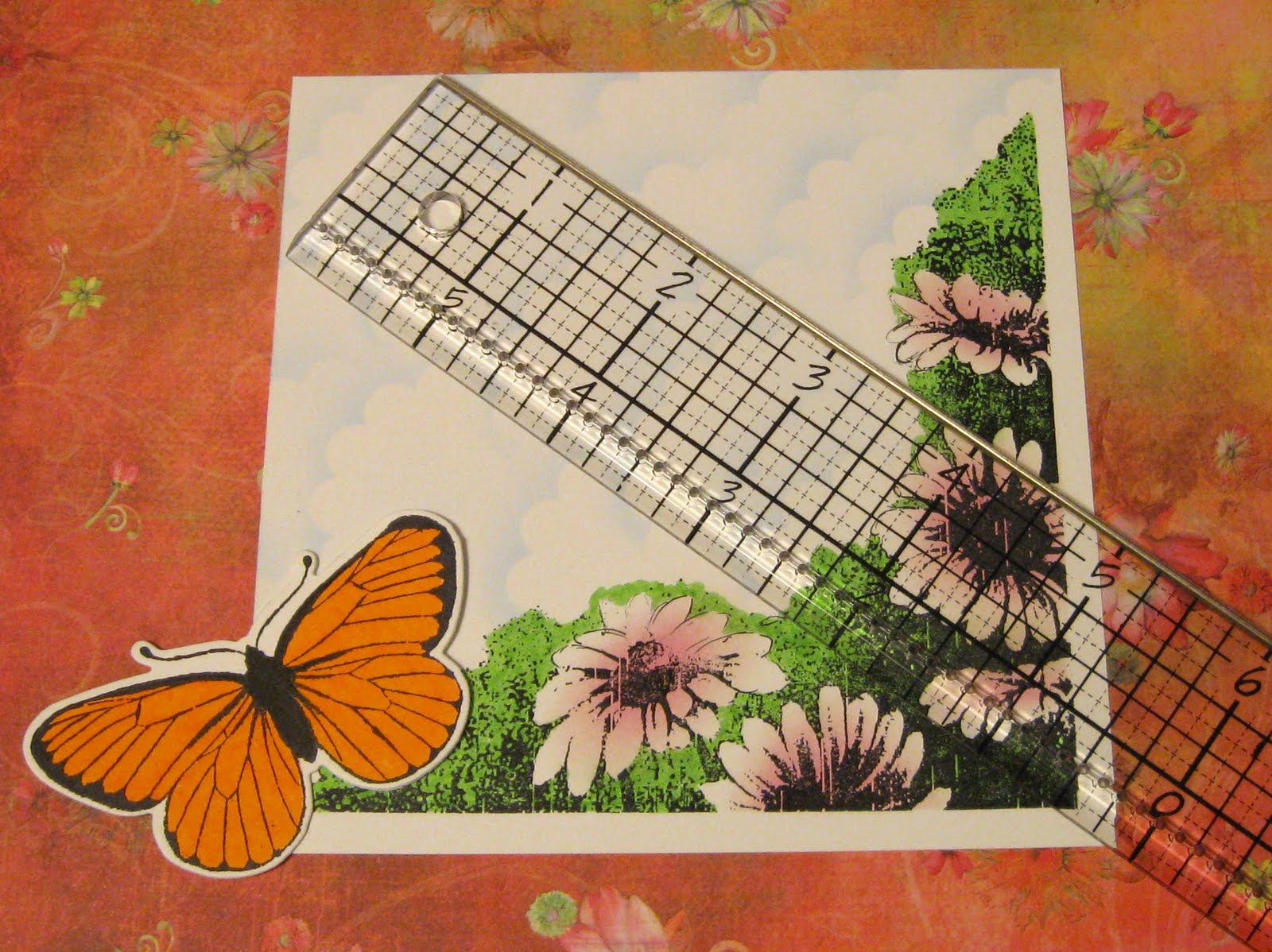 Though you don't necessarily have to have a scene to make a spinner, I chose to use the new Butterfly Corner stamp for my scene, and the Single Butterfly and Butterfly Die to create my spinning item. Once you know the size of your main panel, use a ruler to figure out the size of the spinner panel. So that my butterfly would spin up to the corner, I cut my spinner panel from another piece of cardstock at 3-1/2 inches. When cutting the width of the spinner panel, it should be wide enough to fit one penny and a piece of foam tape on each side....my panel here will be 1-1/2 inches.