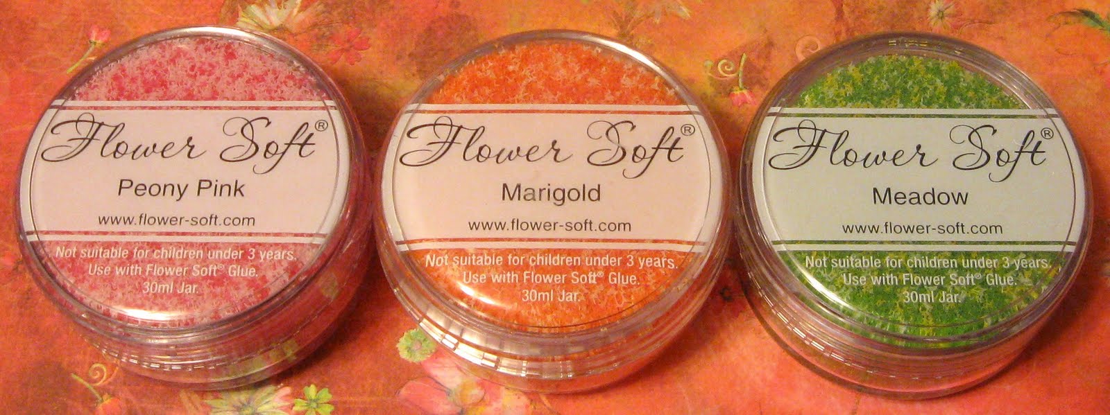 The Marigold Flower Soft was piled on heavily on the glue and tapped down so that the fibers would attach well to the glue. It's always better to pile it on so that you don't get glue on your fingers while tapping it down. Then shake off the excess Flower Soft. I personally like to use a ceramic bowl since there is less static.....I will dump the Flower Soft in the bowl and fluff it up before applying it. If you can't fit the Flower Soft back into the container, Ziploc baggies are a great storage solution.....the Flower Soft stays fluffed for the next use!