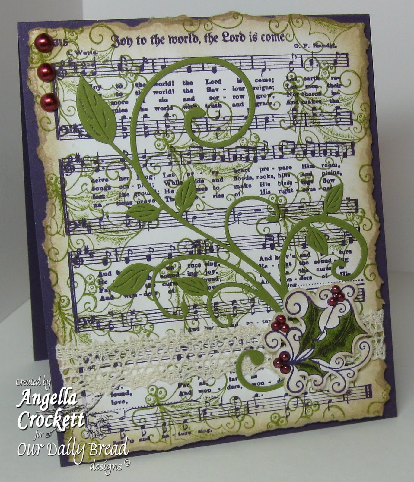The stamp used in the video is an upcoming release for October, called "Joy To The World Hymn". After using the Mega Mount to stamp the hymn background, a collage was created by stamping the holly image from another October release called "Holiday Ornaments". The same holly image was stamped, colored, and cut out to use as an embellishment over the "Fanciful Flourish" by Cheery Lynn Designs. Please click on the image for a close up.