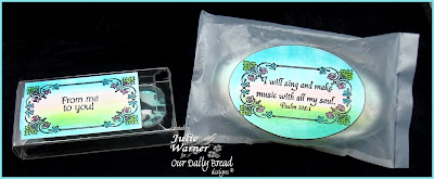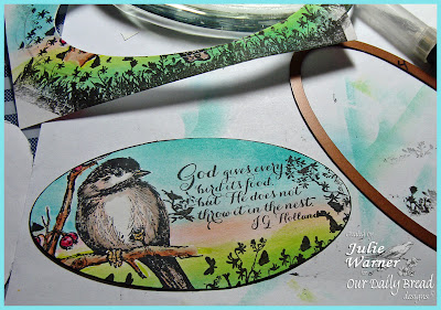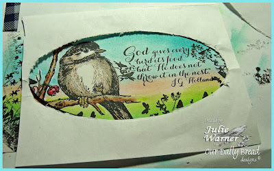 With the mask in place, I sponged the background and stamped the quote and grassy border on the bottoms and sides. On a separate piece of sticker paper, I stamped the small bird labels/corners. I measured the original stickers and they were exactly an inch in diameter, so I used my 1" circle punch. Just a tip if you hadn't thought of it...turn your punch over to see exactly where to punch.