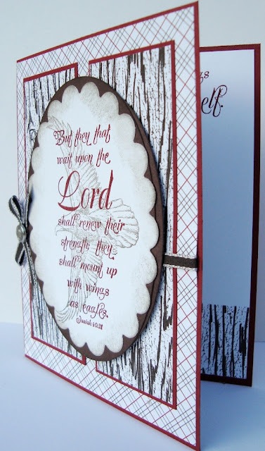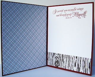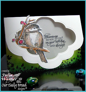 I made a little gift card to go with my set. I used two sizes of the Spellbinders Labels 6... the largest one for the lower edge and the next smaller for the window. I die cut two of the birds and attached the uncolored one to the back of the top one from the inside to give more stability since so much of him is in the opening.